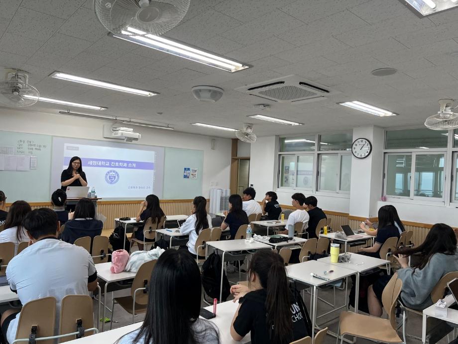 본문 시작 홈으로 커뮤니티 학과소개 교수소개 교육과정 학과소식 학과특성화 사업 커뮤니티 홈페이지가이드 포토갤러리 학사일정 포토갤러리 학생회 학과동아리 학과 취업정보 동창회 학과운영개선의견 발전기금 포토갤러리 페이스북 트위터 프린트 세명고등학교 전공특강 간호학과 1195 2025-07-18 2025년 7월 16일 수요일 정수진 교수님께서 세명고등학교를 방문해 전공특강을 진행하셨습니다. 세명대학교 간호학과를 소개하고 간호사의 다양한 진로와 미래 전망에 대해 알아보는 뜻깊은 시간이었습니다. 간호사를 꿈꾸는 여러분의 빛나는 미래를 응원합니다. 목록 이전세명고등학교 입시(학과)박람회 다음 미래 간호사의 진로와 역할 전공 특강 담당부서 : 간호학과 담당자 : - 연락처 : 043-649-1357 최종수정일 : 2024-10-26 만족도조사 만족도 조사 이 페이지에서 제공하는 정보에 대하여 만족하시나요? 매우만족 만족 보통 불만족 매우불만족