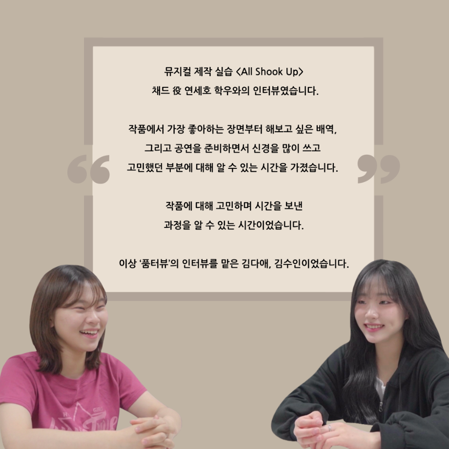 본문 시작 홈으로 커뮤니티 학과소개 입학정보 교수소개 학과과정 커뮤니티 공연예매 안내 홈페이지가이드 포토갤러리 공지사항 포토갤러리 작품DB 동아리 학사일정 학생회 포토갤러리 페이스북 트위터 프린트 ‘품’ 위 있는 인 ‘터뷰’ - 뮤지컬 제작실습 <올슉업> 채드 연세호 카드 뉴스 연기예술학과 2360 2025-01-10 . 목록 이전‘품’위있는 인‘터뷰’ - 24년도 뮤지컬제작실습 학생 연출 <임소정> 다음 ‘품’ 위 있는 인 ‘터뷰’ - 뮤지컬 제작실습 <올슉업> 나탈리 안수연 카드 뉴스 담당부서 : 연기예술학과 담당자 : - 연락처 : 043-649-1733 최종수정일 : 2024-10-26 만족도조사 만족도 조사 이 페이지에서 제공하는 정보에 대하여 만족하시나요? 매우만족 만족 보통 불만족 매우불만족