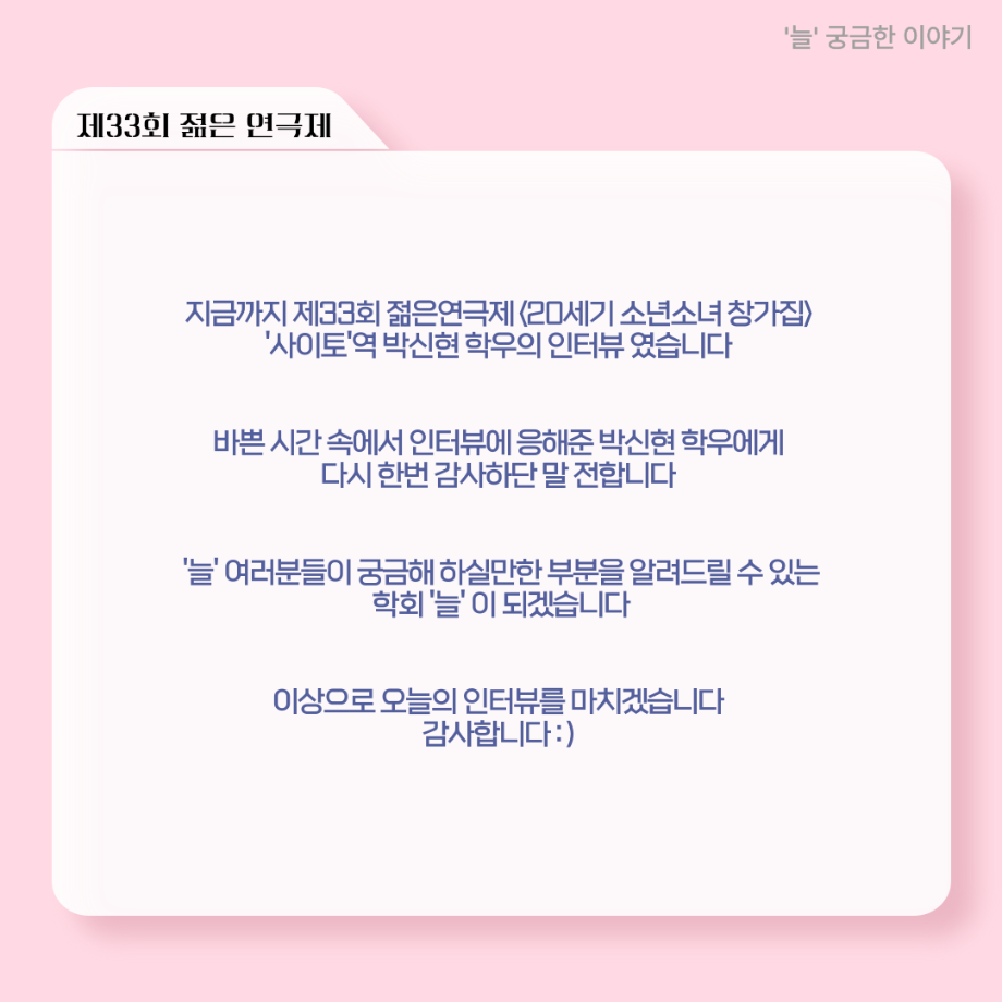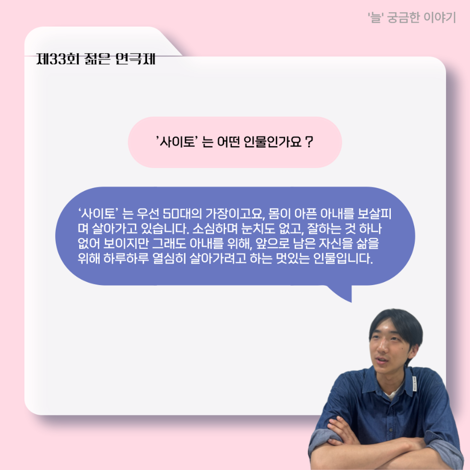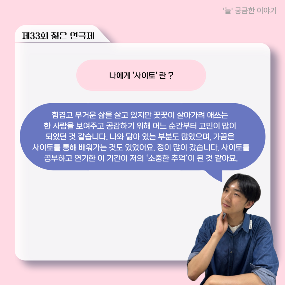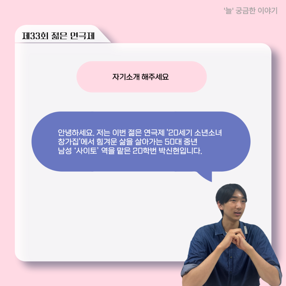 본문 시작 홈으로 커뮤니티 학과소개 입학정보 교수소개 학과과정 커뮤니티 공연예매 안내 홈페이지가이드 포토갤러리 공지사항 포토갤러리 작품DB 동아리 학사일정 학생회 포토갤러리 페이스북 트위터 프린트 ‘늘‘ 궁금한 이야기 - 젊은연극제 ‘20세기 소년소녀 창가집’ 사이토 役 < 박신현 > 연기예술학과 760 2025-08-15 . 목록 다음 2025년 세명대학교 연기예술학과 2학기 개강총회 다음 ‘늘‘ 궁금한 이야기 - 젊은연극제 ‘20세기 소년소녀 창가집’ 종이연극 아저씨 役 < 윤준호 > 담당부서 : 연기예술학과 담당자 : - 연락처 : 043-649-1733 최종수정일 : 2024-10-26 만족도조사 만족도 조사 이 페이지에서 제공하는 정보에 대하여 만족하시나요? 매우만족 만족 보통 불만족 매우불만족
