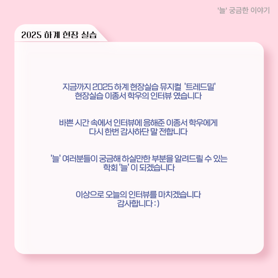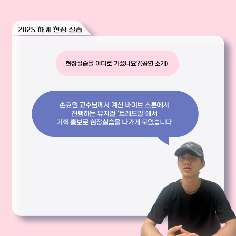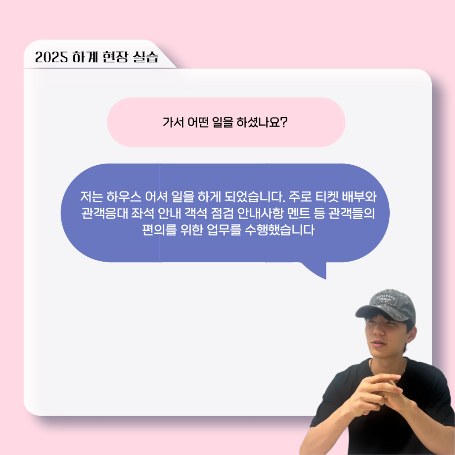 본문 시작 홈으로 커뮤니티 학과소개 입학정보 교수소개 학과과정 커뮤니티 공연예매 안내 홈페이지가이드 포토갤러리 공지사항 포토갤러리 작품DB 동아리 학사일정 학생회 포토갤러리 페이스북 트위터 프린트 ‘늘‘ 궁금한 이야기 - 현장실습 < 이종서 > 연기예술학과 1065 2025-09-17 . 목록 이전‘늘‘ 궁금한 이야기 - 젊은연극제 ‘20세기 소년소녀 창가집’ 다큐pd 役 < 임재완 > 이전117회 세명대학교 연기예술학과 하계프로젝트 사랑의온도 작품소개 담당부서 : 연기예술학과 담당자 : - 연락처 : 043-649-1733 최종수정일 : 2024-10-26 만족도조사 만족도 조사 이 페이지에서 제공하는 정보에 대하여 만족하시나요? 매우만족 만족 보통 불만족 매우불만족