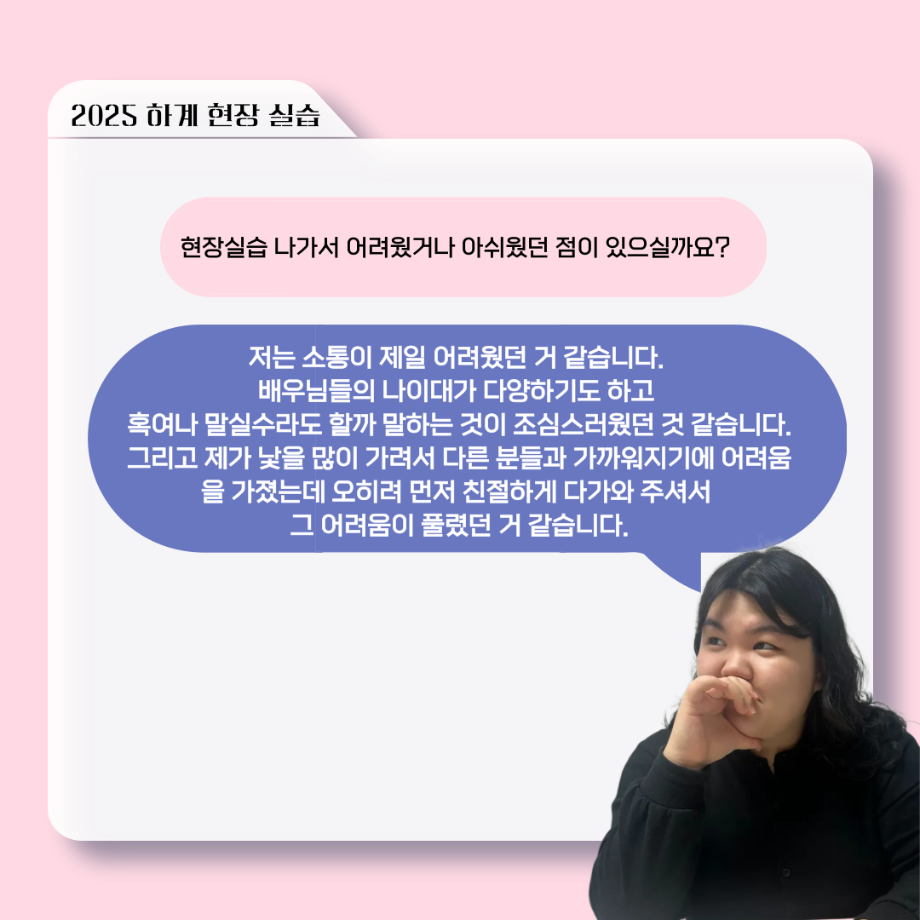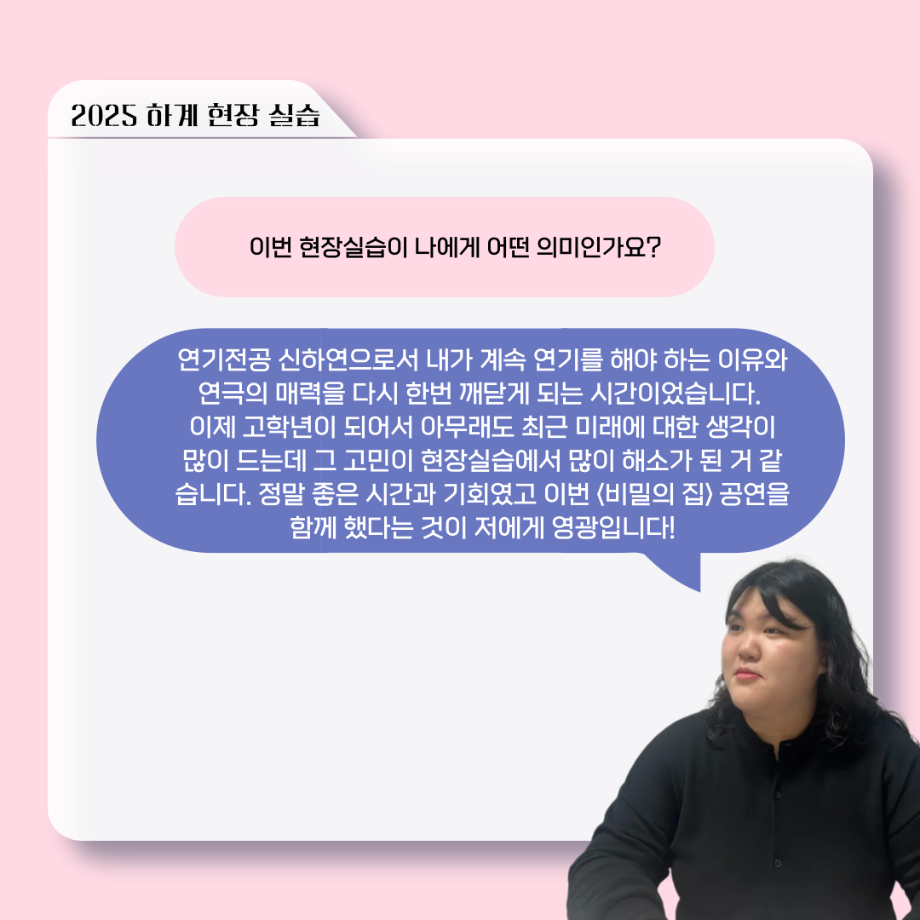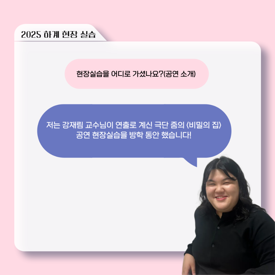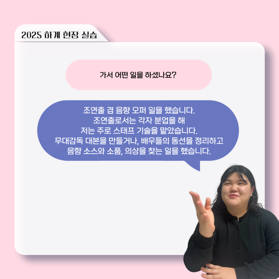 본문 시작 홈으로 커뮤니티 학과소개 입학정보 교수소개 학과과정 커뮤니티 공연예매 안내 홈페이지가이드 포토갤러리 공지사항 포토갤러리 작품DB 동아리 학사일정 학생회 포토갤러리 페이스북 트위터 프린트 ‘늘‘ 궁금한 이야기 - 현장실습 < 신하연 > 연기예술학과 623 2025-10-16 . 목록 이전117회 세명대학교 연기예술학과 하계프로젝트 사랑의 온도 배우 소개 다음 ‘늘‘ 궁금한 이야기 - 하계 프로젝트 ‘컨택’팀 고진役 < 조진석 > 담당부서 : 연기예술학과 담당자 : - 연락처 : 043-649-1733 최종수정일 : 2024-10-26 만족도조사 만족도 조사 이 페이지에서 제공하는 정보에 대하여 만족하시나요? 매우만족 만족 보통 불만족 매우불만족