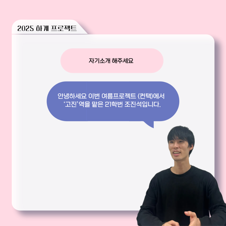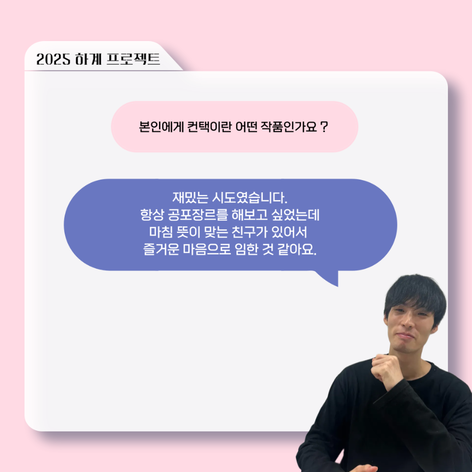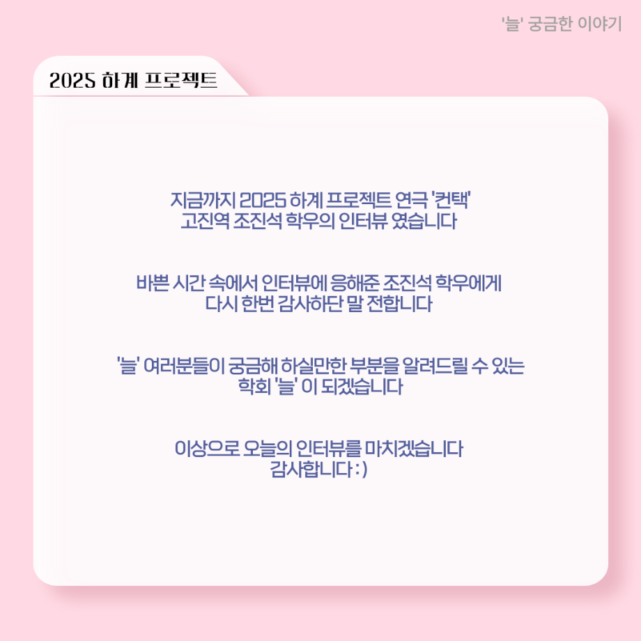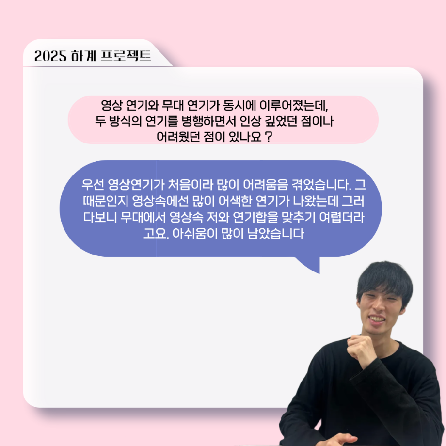 본문 시작 홈으로 커뮤니티 학과소개 입학정보 교수소개 학과과정 커뮤니티 공연예매 안내 홈페이지가이드 포토갤러리 공지사항 포토갤러리 작품DB 동아리 학사일정 학생회 포토갤러리 페이스북 트위터 프린트 ‘늘‘ 궁금한 이야기 - 하계 프로젝트 ‘컨택’팀 고진役 < 조진석 > 연기예술학과 1532 2025-10-31 . 목록 이전‘늘‘ 궁금한 이야기 - 현장실습 < 신하연 > 다음 세명대학교 연기예술학과 과체전 담당부서 : 연기예술학과 담당자 : - 연락처 : 043-649-1733 최종수정일 : 2024-10-26 만족도조사 만족도 조사 이 페이지에서 제공하는 정보에 대하여 만족하시나요? 매우만족 만족 보통 불만족 매우불만족