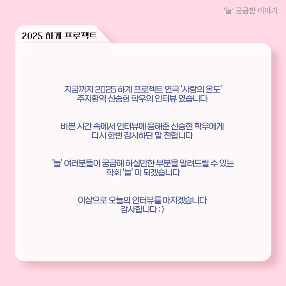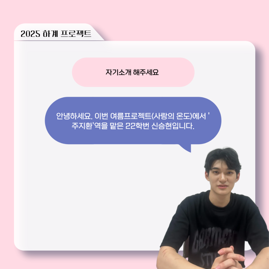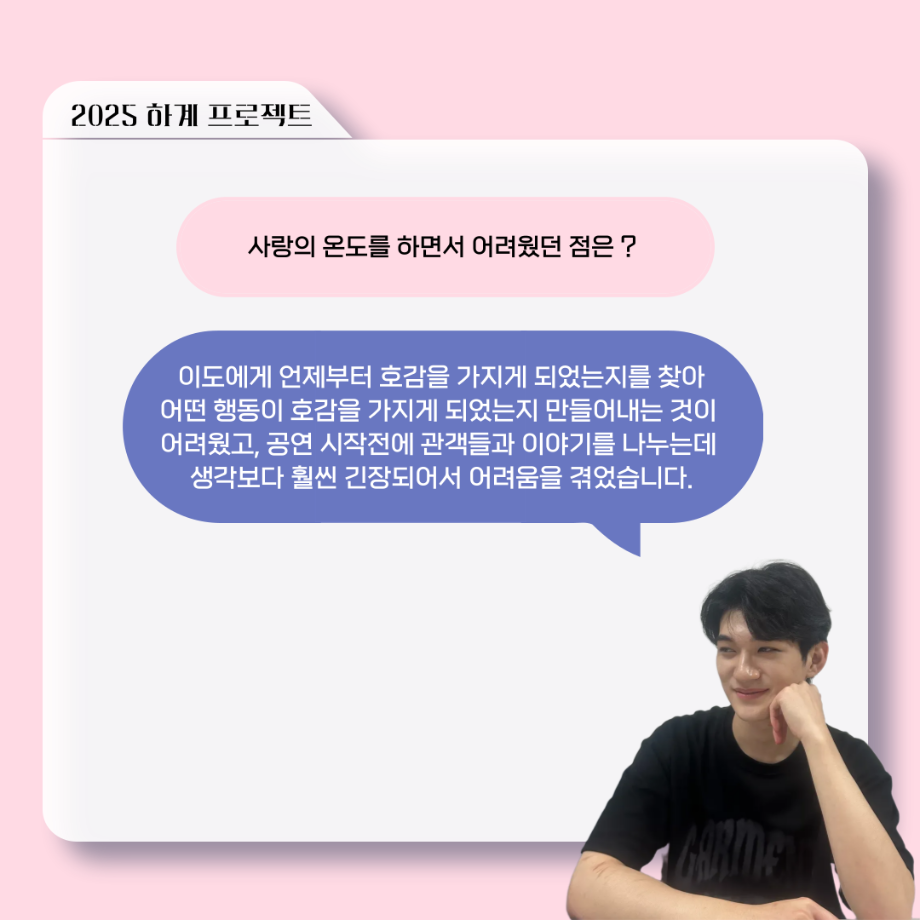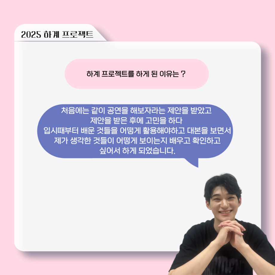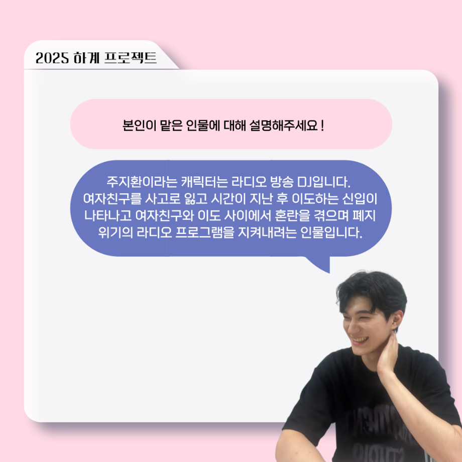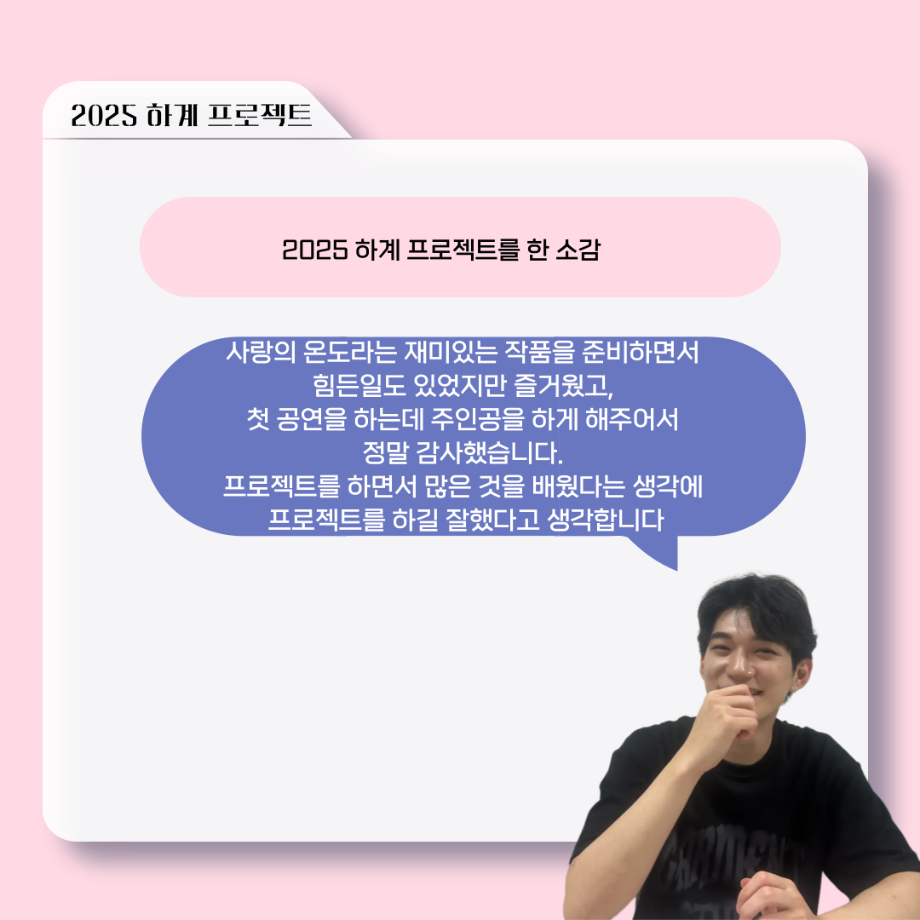 본문 시작 홈으로 커뮤니티 학과소개 입학정보 교수소개 학과과정 커뮤니티 공연예매 안내 홈페이지가이드 포토갤러리 공지사항 포토갤러리 작품DB 동아리 학사일정 학생회 포토갤러리 페이스북 트위터 프린트 ‘늘‘ 궁금한 이야기 - 하계 프로젝트 ‘사랑의 온도’팀 주지환役 < 신승현 > 연기예술학과 431 2025-11-11 . 목록 이전‘늘‘ 궁금한 이야기 - 하계 프로젝트 ‘사랑의 온도’팀 서이도役 < 함유진 > 다음 ‘늘‘ 궁금한 이야기 - 2025 졸업작품 ‘유랑극장’ 노풍찬役 < 김은혁 > 담당부서 : 연기예술학과 담당자 : - 연락처 : 043-649-1733 최종수정일 : 2024-10-26 만족도조사 만족도 조사 이 페이지에서 제공하는 정보에 대하여 만족하시나요? 매우만족 만족 보통 불만족 매우불만족