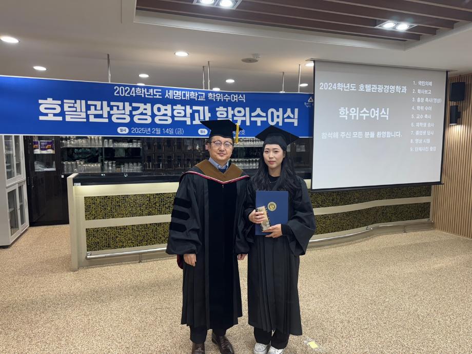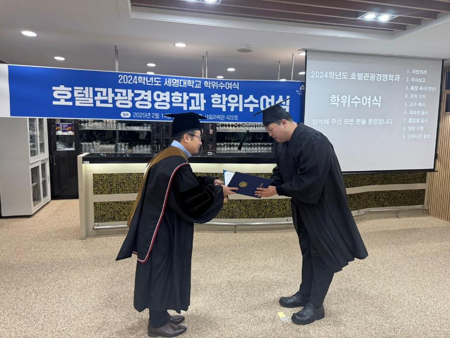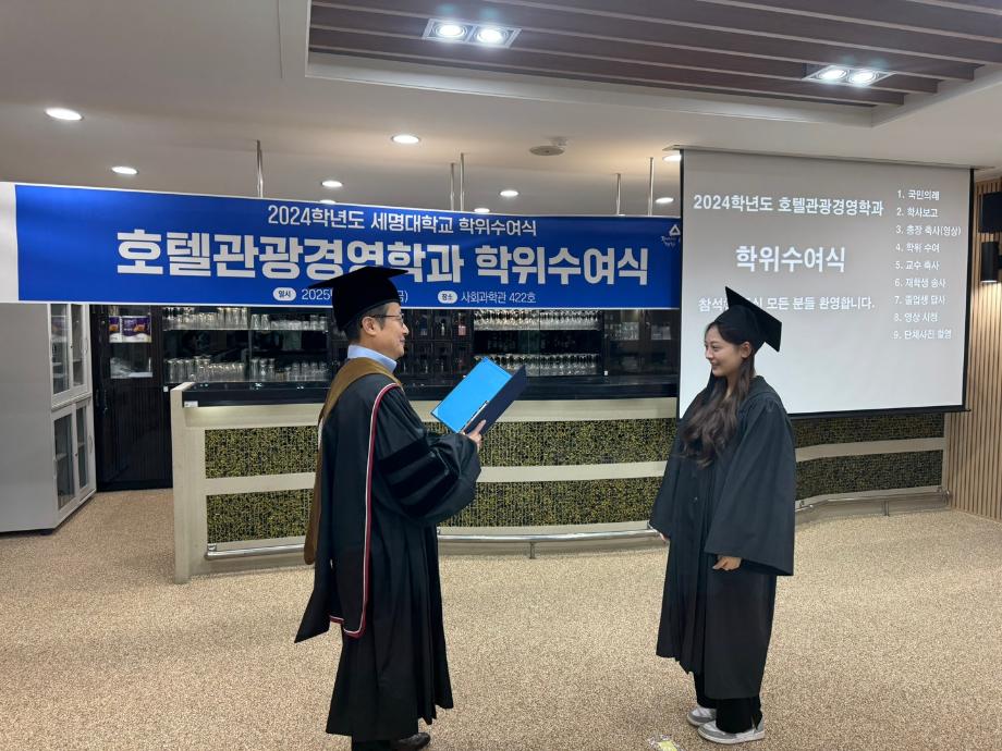본문 시작 홈으로 학과소개 커뮤니티 학과소개 교육 홈페이지가이드 학과행사 학과장인사말 교수소개 학과행사 학과행사 페이스북 트위터 프린트 2025년 2월 졸업식 호텔경영학과 1592 2025-02-14 2025년 2월 졸업식 목록 이전2025년 세명대학교 시무식_호텔경영학과 다음 2025년 신입생 꿈설계학기 1일차 만족도조사 만족도 조사 이 페이지에서 제공하는 정보에 대하여 만족하시나요? 매우만족 만족 보통 불만족 매우불만족