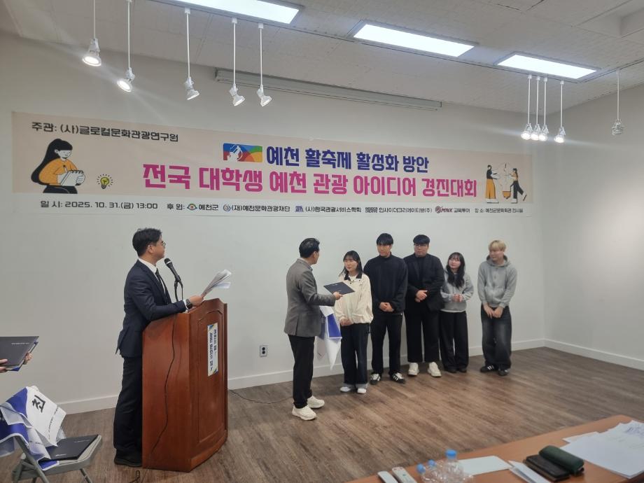 본문 시작 홈으로 학과소개 커뮤니티 학과소개 교육 홈페이지가이드 학과행사 학과장인사말 교수소개 학과행사 학과행사 페이스북 트위터 프린트 [예천 활축제 활성화 방안] 전국 대학생 예천 관광 아이디어 경진대회 호텔경영학과 226 2025-11-07 전국 대학생 예천 관광 아이디어 경진대회에서 3학년 장O빈, 이O준, 윤O빈 학생 2학년 정O찬, 김O민 학생이 우수상을 수상 하였습니다. 목록 이전학과 견학_2025년 제천국제한방천연물산업엑스포 다음 안동 하회마을 공모전 만족도조사 만족도 조사 이 페이지에서 제공하는 정보에 대하여 만족하시나요? 매우만족 만족 보통 불만족 매우불만족