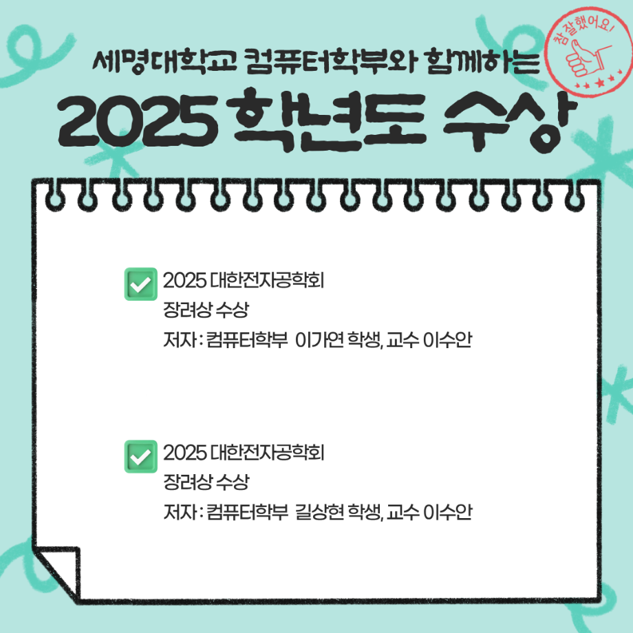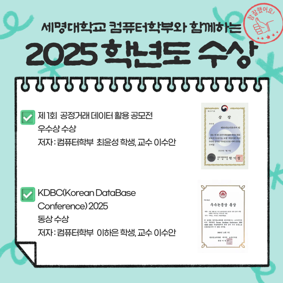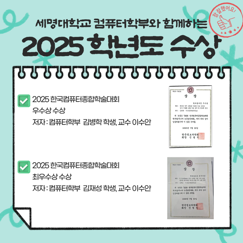 본문 시작 홈으로 학부활동 학부소개 학부활동 교육과정 커뮤니티 학부생활 입학안내 홈페이지가이드 학부갤러리 학부행사 학생회 활동 전공 동아리 학부갤러리 학부갤러리 페이스북 트위터 프린트 컴퓨터학부를 소개합니다 컴퓨터학부 343 2025-12-30 . 목록 이전한국소프트웨어종합학술대회 (KSC2025) 다음 컴퓨터학부 이수안 교수 세계적 AI 학회 AAAI 2026 논문 채택 담당부서 : 컴퓨터학부 담당자 : - 연락처 : 043-649-1272 최종수정일 : 2024-10-26 만족도조사 만족도 조사 이 페이지에서 제공하는 정보에 대하여 만족하시나요? 매우만족 만족 보통 불만족 매우불만족