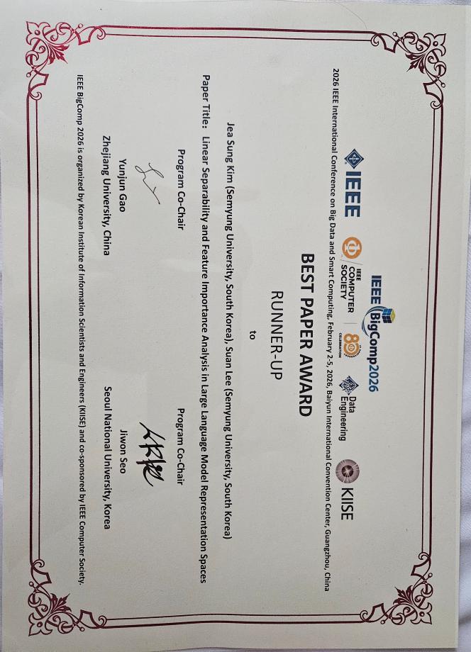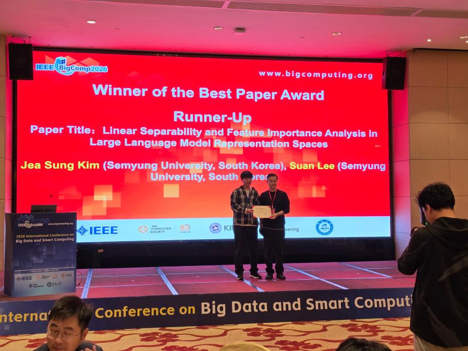 세명대학교 데이터지능연구실, 국제학술대회 'IEEE BigComp 2026'서 우수논문상(Runner-Up) 수상
